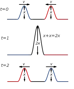 In physics, interference is the meeting of two correlated waves and either increasing or lowering the net amplitude, depending on whether it is constructive or destructive interference. If a crest of a wave meets a crest of another wave at the same point then the crests interfere constructively and the resultant crest wave amplitude is increased; forming a much more powerful wave than either of the beginning waves. Similarly two troughs make a trough of increased amplitude. If a crest of a wave meets a trough of another wave then they interfere destructively, and the overall amplitude is decreased; thus making a wave that is much smaller than either of the parent waves.