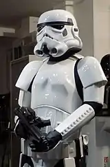 The iconic E-11, a standard mid-range weapon used primarily by stormtroopers, is based on the real-life Sterling sub-machine gun used by the armed forces of the United Kingdom over the second half of the 20th century. Several design changes were made by the filmmakers, such as alterations to the magazine.[1]