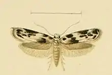 The length of the forewings is about 6 mm. The forewings are white, with blackish-brown markings. The hindwings are shining grey.[2]