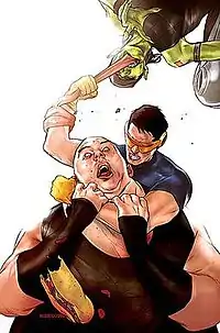 The Ultimate Universe version of Blob, real name Franklin Dukes,[57] is a member of the Brotherhood of Mutant Supremacy. His powers are similar to that of his Earth-616 counterpart, although he has been moved by a helicopter during the Weapon X saga, suggesting that he may be less powerful. He seems to eat constantly, and is often seen browsing the internet or chatting to people via instant messaging. One such incident sees the Blob pretend to be a female model/physicist named Naomi who cyber-seduces the X-Man Beast—leading to the discovery of Magneto's survival and to the Ultimate War saga. Unlike his Earth-616 counterpart, the Blob may very well have additional superhuman-eating powers as part of his mutation, as not only has he threatened to actually eat his enemies alive, but it was expressly stated that he had personally consumed all of the Weapon X computers in a matter of moments when the Brotherhood invaded the Weapon X compound to rescue the X-Men.[58] In Ultimatum, the Blob is seen eating the Wasp, proving the cannibalistic claims are true.[59] However, Hank Pym grows to a gigantic size and bites the Blob's head off in return.[60]