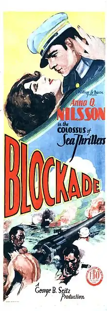 Blockade is a 1928 American sound part-talkie drama film directed by George B. Seitz.[1] In addition to sequences with audible dialogue or talking sequences, the film features a synchronized musical score and sound effects along with English intertitles. The soundtrack was recorded using the RCA Photophone sound-on-film system.