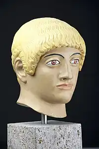 The so-called Blond Kouros's Head of the Acropolis is the head of a lost marble statue of a young man (Kouros or Ephebe sculpture type) of ca 480 BC, in the Acropolis Museum in Athens, Greece[1] The head and part of the pelvis were found in 1923 northeast of the museum site on the Acropolis of Athens. It belongs to the late archaic or early classical period (Severe style). The curly hair points more to the Archaic than the Classical period.