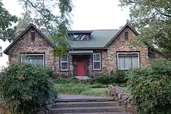 The Bloom House is a historic house at North Maple and Academy Streets in Searcy, Arkansas. It is a 1+1⁄2-story fieldstone structure, with a hip roof and two forward-facing projecting gable sections flanking its entrance. Its roof is finished in green tile, and a single brick chimney rises at the rear of the house. Built about 1930, it is a fine local example of the third stage of Craftsman styling executed in stone in the area.[2]