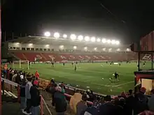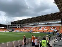 Also in 1906, a 2,000-capacity stand was constructed on the north side of the ground. This new stand was named the Motor Stand and made Bloomfield Road one of the few grounds in England to have stands on all four sides of the ground. Partly erected, it was opened for the first time on 10 November for the visit of West Bromwich Albion.[5] The club organist a whist drive at the Conservative Club to help defray the expense. The stand was borrowed from the Blackpool Corporation and practically filled the north side of the ground. It was purchased from the council in June 1908 at a cost of £100.[5]