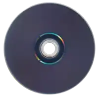 Reverse side of a Blu-ray. Unlike CD and DVD, the reflection has a blue hue. Branded colors include silver, gold, and grey.