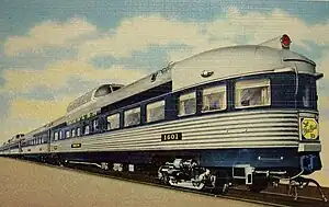 The Wabash relaunched the Blue Bird as a streamlined train on February 26, 1950, with all-new Budd Company "Vista-Dome" dome cars and E-unit diesel locomotives from Electro-Motive Division. The new train carried Wabash's standard blue-gray-white livery.[1]:144 The Wabash referred to the Blue Bird as a "Domeliner" in contemporary advertising.[2] Amenities on the new train included radio and "recorded musical programs"; coach passengers had access to the "Coffee Shop Club".[3] The new equipment cost the Wabash US$1,500,000; it was the first dome train to operate between Chicago and St. Louis.[4]