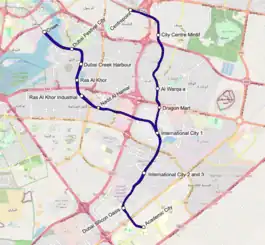 The Dubai Metro Blue Line is a planned rapid transit line in Dubai, United Arab Emirates. The line will be the third metro line in the city, after the Red, Green lines. [1] The line will have a total length of 30 kilometres and 14 stations, connecting the neighbourhoods of Rashidiya, Al Warqaa, Mirdif, Dubai Creek Harbour, Dubai Silicon Oasis, Dubai Academic City, and Dubai International City. The line will also have interchanges with the existing and future metro lines, as well as the Etihad Rail network.[2]