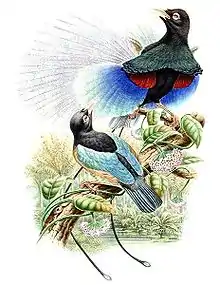 The blue bird-of-paradise was formally described in 1886 by the German naturalists Otto Finsch and Adolf Bernhard Meyer. They placed the bird in a new genus Paradisornis and coined the binomial name Paradisornis rudolphi.[2] The genus name Paradisornis combines the Ancient Greek paradeisos meaning "paradise" with ornis meaning "bird". The specific epithet rudolphi was chosen to honour Archduke Rudolf Franz Karl Joseph, the Crown-Prince of Austria.[3] This species was formerly placed in the genus Paradisaea.[4]