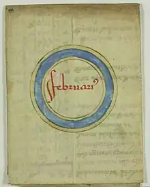 Latin 7478 consists of 17 folded leaves, perhaps previously attached to the tabs, but throughout the manuscript conservation it has obtained a new binding more like a traditional codex. It follows the pattern similar to what Johan Peter Gumbert calls H6r pattern: with the leaves opening on the top as well, then the first compartment unfolding the right, and only the last one on the left.[5][6] Latin 7478 has been copied by Paul of Kignin (could be also read as Szignin), whose autograph is found on folio 15, alongside with the supposed date of the manuscript production: 1456. The identity of the scribe remains to be investigated. However, some of the scholars presume that at least two people have been involved in the production of Latin 7478: a rather skilled almanac-maker, able to abbreviate diagrams and tables with a minimal loss of information, and a less experienced scribe, able to adapt 19-years cycles to a required date, lacking the knowledge to perform this procedure without distorting the time of syzygies.[7]