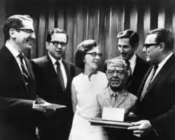 A picture of a bust of Bartlett on May 6 1969. L-R: Congressman Howard Pollock, Senator Ted Stevens, Vide Bartlett, Senator Mike Gravel, Senator Warren Magnuson.