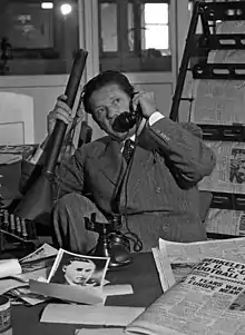 Bob Burns sitting at his desk holding his bazooka