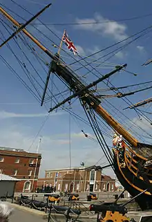 Bows of HMS Victory: three parallel bobstays, separate dolphin-striker with martingale stays.