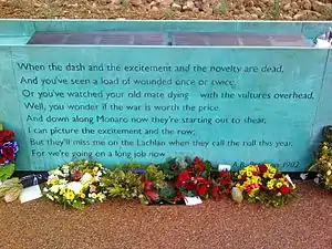 On the front plinth is a piece of poetry about the Boer War, written by Australian poet Banjo Paterson in 1902, that mentions the Monaro region in which Canberra is sited.