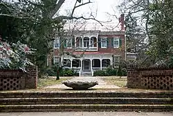 The first bricks, made on John Byne's plantations, were laid on February 25, 1839, starting with the brick kitchen; all of the brickwork was finished by early July. They moved into their new home 10 months later.[5] Designed by an unknown professional architect, the main house, known then as the John Byne Walker Townhouse, was originally a four-over-four traditional Georgian manor house with rooms 20’x 20’, eight fireplaces, 18"-thick walls, silver doorknobs and 13' ceilings.[6] The Georgian-style house featured a small one-story portico with four white columns,[7] with small brick "summer houses" on either side (now a tea house and an orangery) and, in back, a three-room brick kitchen flanked on either side by matching his and her brick “necessaries”. Today, the 13-acre (53,000 m2) estate includes, in addition, a two-room cabin originally from downtown Madison and one of the oldest buildings in the town (c. 1810–1815), a slave cabin (c. 1830), a tenant house (c. 1900), a classic 1880s Victorian carriage house, a 1920s log smoke house, and a working well. Of particular note is the classic formal boxwood garden dating from around 1850 and described in numerous books on historic gardens of the South.[8]