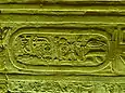 An example of a wall relief scene from Edfu at the Temple of Edfu shows a cartouche with the joint of meat hieroglyph. Another less common hieroglyph pictured within the cartouche is the vertical standing mummy hieroglyph.
