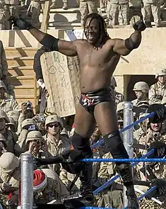 On October 21, SmackDown! General Manager Theodore Long placed Booker in a six-man tag team match with Rob Van Dam and Rey Mysterio against John "Bradshaw" Layfield (JBL), René Duprée, and Kenzo Suzuki. JBL expected Booker to betray his partners, but instead Booker pinned him, thus turning face again. Booker T faced JBL for the WWE Championship at the Survivor Series on November 14, but lost after he was hit in the head with the championship belt.[35] The next night, Booker T demanded a rematch, citing Orlando Jordan's interference. He was then joined by Eddie Guerrero and The Undertaker who also wanted a shot at JBL's title, prompting Theodore Long to make a fatal four-way match for the WWE Championship at Armageddon.[11] Once again, Booker failed to win the title, as JBL retained it.[36] He then briefly teamed with Eddie Guerrero, at one point challenging Mysterio and Van Dam for the WWE Tag Team Championship, and feuded with Heidenreich.[11]