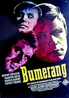 Boomerang (German: Bumerang) is a 1960 West German crime thriller film directed by Alfred Weidenmann and starring Hardy Krüger, Martin Held and Mario Adorf.[1] [2] It was shot at the Tempelhof Studios in West Berlin and on location around the city. The film's sets were designed by the art directors Wolf Englert and Ernst Richter.