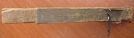 The clicker's knife regularly needed sharpening, which was done with an implement called a rap stick. To use a rap stick, a right-handed operator would hold it in the left hand, resting the stick on the workbench for support, stroking the blade rapidly but gently back and forth on the abrasive surface to maintain a sharp edge whilst hand-cutting, in a similar fashion to a butcher's knife and sharpening steel. The knife blade shown is a lighter medical item but approximates the shape of a clicker's knife blade, fitting into a comfortable wooden handle with screw-activated jaws.[1] The main surface is emery cloth wrapped over the edge to form a round section where the curved blade can nestle and be sharpened; the top edge is sharper and square in cross-section, with a fine-grain aluminium oxide abrasive strip used for tip-sharpening. On the reverse side is a heavy-leather smooth strop, to address any metal burrs left by the abrasive process.[2]