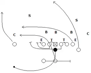 The "Waggle" play from the Delaware Winged T offense, here shown from "Red" formation, is one type of bootleg. The quarterback fakes hand offs to both the halfback and fullback before rolling out with the protection of both guards. The quarterback then has the choice of passing or running the ball.