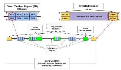 They were discovered in March 8 2020 by Jill and others. The structure of Borg genomes are conserved and are distinguished from the plasmids and chromosomes of Methanoperedens, as well as other archaeal genomes.[8] Borgs do not possess discernible proteins that are associated with plasmids or viruses, rRNA loci, origins of replication, or vital genes that are commonly found within minichromosomes, also known as megaplasmids, of archaea.[1] A sample of borg genomes have been found to measure between 0.66-0.92 Mbp long, which is beyond the genome length of archaea viruses currently known.[8] Instead, the size of Borg genomes are characteristic of eukaryote-specific double-stranded DNA viruses from the phylum Nucleocytoviricota, also known as nucleocytoplasmic large DNA viruses (NCLDV), which can surpass 2.5 Mbp.[8][9] Tandem direct repeat sequences are prevalent throughout a Borg's genome, and long inverted repeats terminate the genome. This differs from the megaplasmids of some bacteria, which carry interspaced repeats and usually are not responsible for encoding necessary genes.[8]