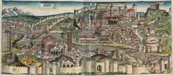 Rome at the end of the 15th century according to Schedel: Borgo Vecchio is the road between the Castle and Saint Peter left of the pyramid called Meta Romuli