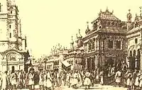 The Revised Version of 1872 received its world premiere on 27 January 1874 at the Mariinsky Theatre. The Cell Scene was omitted. The Novodevichiy and Coronation scenes were combined into one continuous scene: 'The Call of Boris to the Tsardom'. Matvey Shishkov's design for the last scene of Pushkin's drama, 'The House of Boris' (see illustration, right), was substituted for this hybrid of the Novodevichiy and Coronation scenes.[38] The scenes were grouped in five acts as follows:[39]