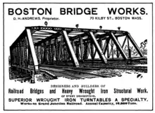 The establishment of Boston Bridge Works was in the year 1876 by David H. Andrews,[1] building notable bridges, such as the 1892 Harvard Bridge between Cambridge and Boston.[3] The company also constructed bridges for many New England railways such as the Boston and Maine Railroad and Boston and Providence Railroad.[1]