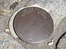 A private property line plaque separating the private property and the public right of way on a sidewalk in New York City. It declares that the public may utilize the space inside the private property by a revocable license, to prevent it to become a prescriptive easement.[3]