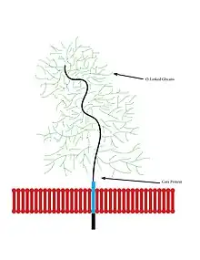 Mucin originates from the mucus secretions from submaxillary glands, which are salivary glands that are located under the floor of the mouth. The secreted mucin assists in digestion by coating the bolus such that it travels easily through the digestive tract. Mucins are constituents of one class of glycoproteins: sialic acid-containing glycoproteins, or mucoproteins.[5] They have a high molecular weight and exist as either membrane-bound or secretory mucins. The membrane-bound type have a hydrophilic area that extends along a membrane and attaches to cellular surfaces. Secretory mucins are the main components of the mucous gel layer that coats the epithelium.[3]