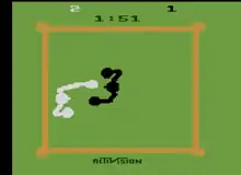 Boxing is a video game interpretation of the sport of boxing developed by programmer Bob Whitehead for the Atari VCS (later renamed to the Atari 2600).[1] It was published by Activision in 1980. It's one of the first video games developed by Activision. The game is based on Boxer, an unreleased 1978 arcade game from Whitehead's previous employer, Atari, Inc.[2] Boxer was written by Mike Albaugh who also wrote Drag Race for Atari, a game cloned by Activision as Dragster.[3]