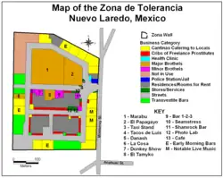 Boy's Town, (or "La Zona" (en: the Zone) as it is known in Spanish), is a commercial district in the border town of Nuevo Laredo, Tamaulipas, Mexico, serving primarily as a "zone of tolerance" in the city for legal prostitution, and also a variety of other nocturnal entertainment. It is a walled compound containing three short east-west streets and two short north-south streets.[1] It houses a range of brothels, bars, restaurants, small stores, a small police station, and a health clinic. It is located near the intersection of Monterrey and Anahuac Streets, about 5 km southwest of International Bridge #1. Providencia Cantu was the one who came up with the name. She used to own a place there named "El Baston".