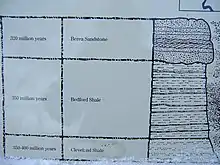 An exhibit near the falls includes a photo of the waterfalls, a map of the area, and a cross-sectional drawing of the rock with: * Berea sandstone (320 million years), * Bedford Shale (350 million years), and * Cleveland Shale (350 - 400 million years)[5]
