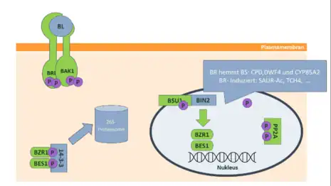 In Arabidopsis, the process begins with the BRI1 receptor (Brassinosteroid Insensitive 1 receptor). This receptor is a type of protein called a leucine-rich receptor kinase and allows brassinolide to attach to it from outside the cell. This binding causes a change in the receptor's shape, and it then interacts with another protein called BRI1 associated receptor kinase 1 (BAK1). This interaction results in both proteins being chemically modified by the addition of phosphate groups in a process called phosphorylation. This, in turn, sets off a chain reaction within the cell, activating some proteins and inhibiting others, including various kinases, phosphatases, and transcription factors. Among the activated proteins are the BR signaling kinases (BSK1, BSK2, and BSK3). Their activation, in turn, activates the phosphatase BRI1 suppressor1 (BSU1), which removes a phosphate group from another protein called brassinosteroid insensitive 2 (BIN2). Removing this phosphate group inactivates BIN2, an important enzyme. As a result, protein phosphotase 2A (PP2A) can remove phosphate groups from two transcription factors, brassinazole-resistant-1 (BZR1) and BRI1-EMS-suppressor-1 (BES1), allowing them to accumulate within the cell's nucleus. There, they control the expression of specific target genes, which are involved in various cellular processes. However, when there's no brassinolide around, a regulator called BRI1 kinase inhibitor (BKI1) prevents the BRI1 receptor from interacting with the BAK1 co-receptor. This prevents the activation of BIN2, causing BZR1 and BES1 to be chemically modified by adding phosphate groups. These modified transcription factors then interact with a protein called 14-3-3 and accumulate in the cell's cytoplasm. Eventually, they are broken down and degraded by a 26S proteasome. In this way, BIN2 kinase serves as an essential negative regulator, dampening the activity of the central transcription factors BES1 and BZR1.[6]