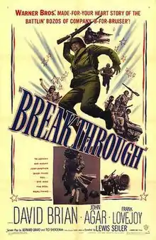 Breakthrough is a 1950 American war film directed by Lewis Seiler and starring John Agar about an American infantry unit in World War II. Approximately one-third of the film was assembled from preexisting footage.[3]