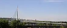 Ada Bridge (Мост на Ади) is a cable-stayed bridge which crosses the tip of Ada Ciganlija island, connecting the municipalities of Čukarica and New Belgrade. The bridge pylon is located on the tip of the island, which has been reinforced with large amounts of concrete and has been slightly enlarged to provide stronger foundations. Construction began in 2008, and the bridge was opened on 1 January 2012.[24][25] Component parts of the deck were manufactured in China and delivered in transportable units on a sea and river-route via Rotterdam through the Rhine–Main–Danube Canal to the pre-assembly yard next to the construction site at Mala Ciganlija in Belgrade.[26] The bridge is designed to significantly reduce traffic passing through the city center and the Gazela Bridge. It is planned to be part of the future Belgrade Inner City Semi-Ring Road.[27] It has three road lanes and a tram (light rail) track in each direction.[28] The bridge was featured in the fifth episode, season nine of the Discovery Channel documentary television series Build It Bigger.[29]