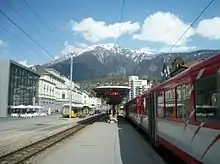 Small-gauge part of the Brig railway station, with Alpine peaks in the background.