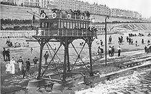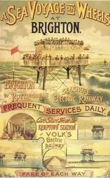 The Brighton and Rottingdean Seashore Electric Railway was a unique coastline railway in Brighton, England, that ran through the shallow coastal waters of the English Channel between 1896 and 1901.[1] It was designed by Magnus Volk to extend his Volk's Electric Railway from its terminus in Paston Place to the village of Rottingdean and avoid difficult terrain. While the unique railway was popular and carried tens of thousands of passengers, it was ultimately abandoned to make room for new sea defences, and Volk was unable to raise the funds to construct a replacement.
