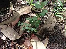 The endangered Somersby mintbush (Prostanthera junonis) is only known to occur in the Somersby Plateau area in 9 locations after having been previously present in a broader range.[14] The bush grows low with most of the branches growing along the ground to a maximum height of around 30 cm. Its flowers are pale mauve to almost white.[15] Most of the remaining population are present in Brisbane Water National Park and face similar threats to Camfield's Stringybark which are: habitat degradation, invasive weed competition, and inappropriate fire regimes.[15]