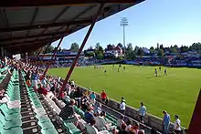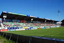 In 1982, the club decided that it would build a new 2,400-seat stand on the eastern long side. A low construction cost was secured because the construction industry was going through a slump. The costs were covered by NOK 2.5 million in national lottery grants and NOK 2 million in loan, which was planned to be repaid through increased sponsor and ticket revenues from increased attendance.[8] The upgrade also included a reconstruction of the club house to facilitate luxury boxes. They were made available for sponsors, who were allowed to bring guests. The boxes and the vestibule became an important informal meeting area for the town's political and business elite.[9]