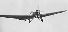 Weight saving was a priority and the airframe, other than the steel tube engine mount and cowling, used a wood shell.[14][2] It with a plywood skin glued to the mahogany longerons and struts that formed the internal structure, which was faired throughout to reduce drag. A conventional fixed undercarriage was used as it was more important to reduce the weight than the drag, and a retractable undercarriage would have been counterproductive.[14] The wings were constructed in three sections with a centre section integral with the fuselage. Three spars with plywood webs and mahogany flanges were used, covered with plywood sheeting.[14]