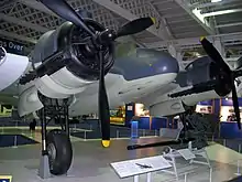 The twin Bristol Taurus engines of the Beaufort, having been deemed insufficiently powerful for a fighter, were replaced by more powerful two-speed supercharger-equipped Bristol Hercules radial engines. These powered three-bladed Rotol constant-speed propellers; both fully feathering metal and wooden blades were used.[19] The extra power had presented vibration issues during development; in the final design, the engines were mounted on longer and more flexible struts, which extended from the front of the wings. This change moved the centre of gravity (CoG) forward, a typically undesirable feature for an aircraft, thus the CoG was moved back to its proper desirable location by shortening the nose, which was possible as the space within the nose had been previously occupied by a bomb aimer, a role that was unnecessary in a fighter aircraft. The majority of the fuselage was positioned aft of the wing and, with the engine cowlings and propellers now further forward than the tip of the nose, gave the Beaufighter a characteristically stubby appearance.[1]