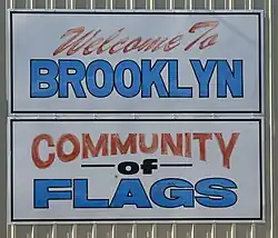 Brooklyn is a city in Poweshiek County, Iowa, United States. The population was 1,502 at the 2020 census.[2] It is located just off U.S. Route 6 and a few miles north of Interstate 80. Near the center of town, Brooklyn boasts a large display of flags from each of the fifty states, branches of the military, and a smattering of other sources. The city bills itself as "Brooklyn: Community of Flags."