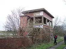 Broom first appeared in public timetables in November 1880.[8] Meagre passenger facilities were provided in the shape of two old coach bodies and a small brick booking office; a sectional concrete shed was added later.[9] At first two north and south signal boxes were provided, but this arrangement was rationalised in 1934 by the London, Midland and Scottish Railway, which concentrated the junction's workings into one box known as Broom Junction.[10] The advent of the Second World War led to the installation of a south-to-east curve between the SMJR and Barnt Green line to allow through running of Gloucester to London services.[11] This required two new signal boxes: one on the curve entrance from Stratford known as Broom West, and another on the original connecting line known as Broom East. All three later closed on 5 July 1962.[12]