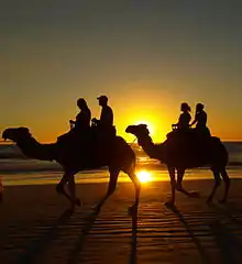 Named for the Java-to-Australia undersea telegraph cable that reaches shore there, Cable Beach is situated 7 km (4.3 mi) from town along a bitumen road. The beach itself is 22.5 km (14.0 mi) long with white sand, washed by tides that can reach over 9 m (30 ft).[3] Located directly east of Cable Beach over the dunes is Minyirr Park, a coastal reserve administered by a collaboration of the Shire of Broome and the Yawuru people.