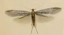 The wingspan is about 7 mm. The head is ochreous-yellowish to light yellowish -fuscous. Forewings are shining ochreous-grey. Hindwings grey. The larva is pale greenish; dorsal and subdorsal lines darker; dots whitish and the head pale brown. Plate of 2 yellowish, brown-dotted.[1]