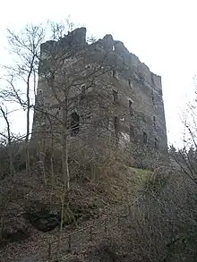 - Balduinseck castle ruin (monumental zone) – built beginning in 1325 by Archbishop Baldwin of Luxembourg, finished about 1332, by 1780 in disrepair, parts of the courtyard wall renovated in 1966; castle courtyard with mighty residential tower, bailey with partial moat