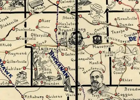 A number of historic communities in Buchanan County once appeared on state maps, but no longer exist. Hamerville was located east of Brandon at the intersection of Highway 150. Today, the site is the location of three farmhouses. Vista, once located between Brandon and Independence, appeared on maps frequently until the 1950s. This site is not even accessed by paved road. Kier, between Fairbank and Littleton, appeared on many maps in the 19th century and early 20th century. The area is now settled by Amish. Several towns named Middlefield existed southeast of Winthrop, but none are populated today. Newtonville was located a few miles south of Monti. The houses at Castleville were later moved to Aurora. Wise, once located between Independence and Jesup just north of Highway 939, was a train-stop between the 1920s and the 1950s. Little remains at the site. Kiene was founded in 1911 between Quasqueton and Monti, but was empty by 1955. Few or even no houses remain at any of these sites.