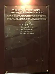 - ↑ Bloom, Barry M. (July 25, 2008). "Statue of Buck O'Neil unveiled at Hall: Negro Leagues great also receives eponymous award". MLB.com. MLB Advanced Media, L.P. Retrieved 2011-10-16.