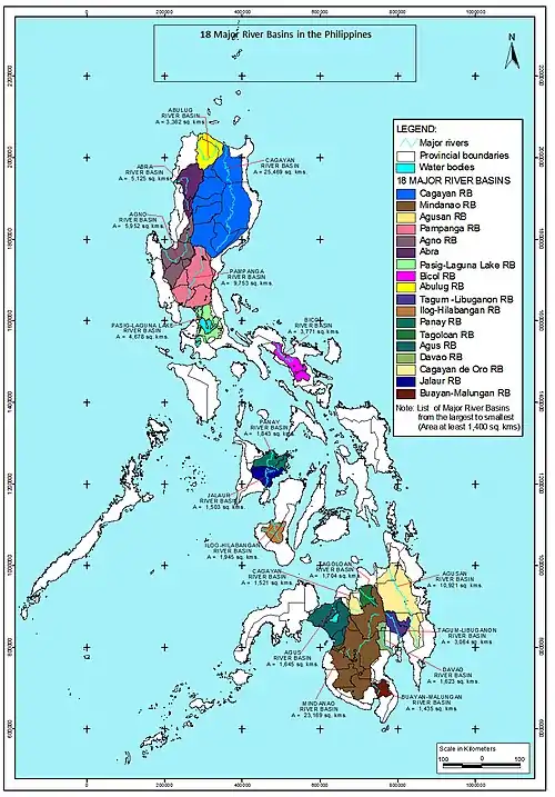 Rivers in the Philippines are grouped into 18 major river basins. Of these, the Cagayan, the country's longest river,[1] has the largest drainage basin, followed by the Mindanao, the Agusan, and the Pampanga.[2]