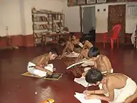 Tibetan woman reading Tibetan Buddhist scriptures (above), Veda Pathashala students learning the Vedas (below).